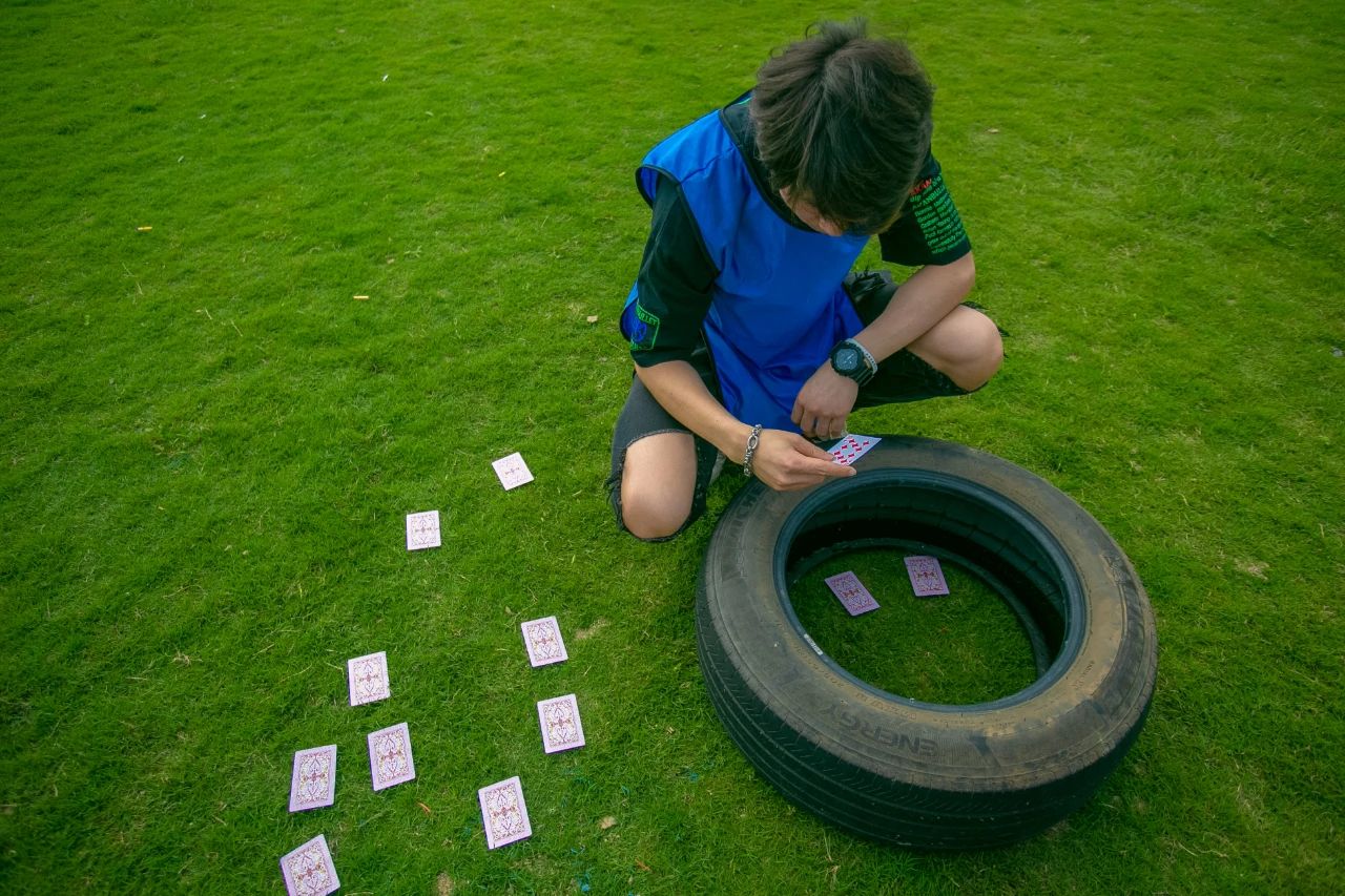 午餐休息之后,熱身活動團(tuán)隊解碼,隊員在規(guī)定的時間內(nèi),將反扣在地面的26張撲克牌依次按照順序翻牌。