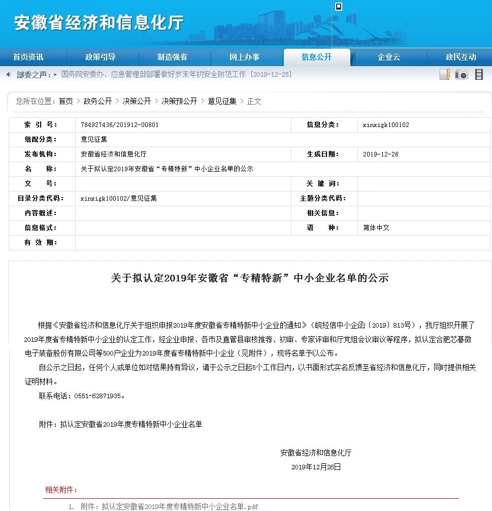 2019年12月26日,安徽省經(jīng)濟和信息化廳管理官網(wǎng)公示了安徽省“專精特新”中小企業(yè)名單,通潮精密榜上有名。
