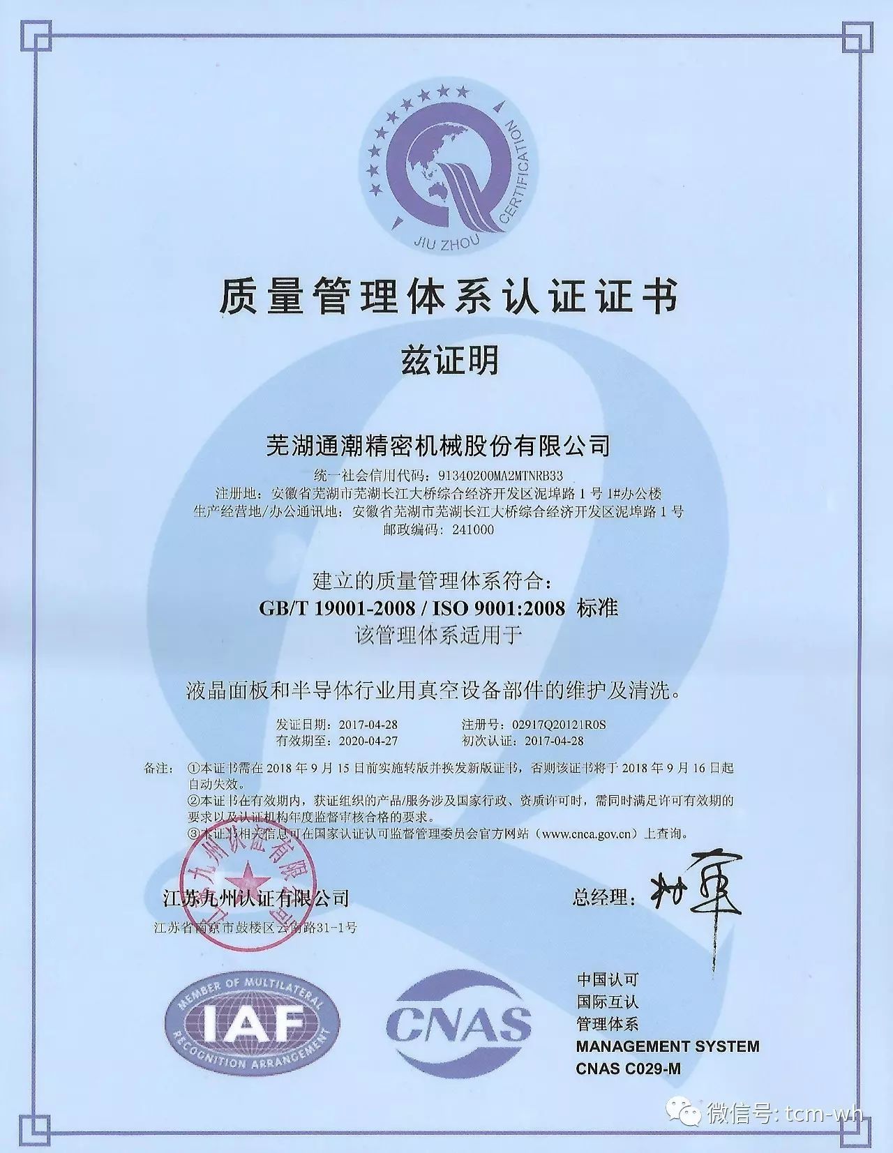 2017年4月28日,蕪湖通潮獲得ISO9001國際質(zhì)量管理體系認(rèn)證。